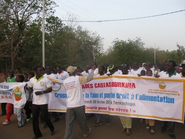 Le 28 février 2008, à l’appel de l’OCADES Caritas Burkina, des centaines de personnes, majoritairement jeunes, ont convergé dès 6h du matin au rond point du gouvernorat de Tenkodogo pour un cross populaire contre la faim et pour le droit à l’alimentation. Le circuit de 2 kilomètres a été bouclé en moins d’une heure. A travers le sport, l’OCADES Caritas Burkina affirme toute sa détermination à venir à bout de ce fléau deshumanisant qu’est la faim. Les fonds collectés au cours de la nuit du plaidoyer et du cross ont permis d’offrir des vivres à l’association Saint Camille de Lellis qui œuvre pour la prise en charge des personnes souffrant de handicap mental. Les dons permettront d’initier une cantine pour ces personnes.