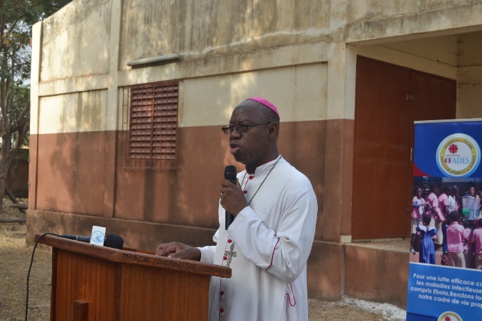 Le Président de l’OCADES Caritas Burkina, Monseigneur Justin KIENTEGA, a, dans son allocution, rendu gloire à Dieu pour son Esprit Saint. Il pense que l’OCADES a fait œuvre utile en soulageant les populations vulnérables. Les populations, dit-il, savent désormais comment éviter les maladies infectieuses. Monseigneur a poursuivi en remerciant l’équipe du Secrétariat Général, l’équipe du Projet, les Secrétariats Exécutifs Diocésains, le secrétariat national de l’Enseignement Catholique, l’Association des Structures de Santé Privée Catholiques, le comité de pilotage et le Ministère de la Santé pour l’atteinte des résultats engrangés. Un merci particulier a été adressé aux différents partenaires MISEREOR et Kindermission.