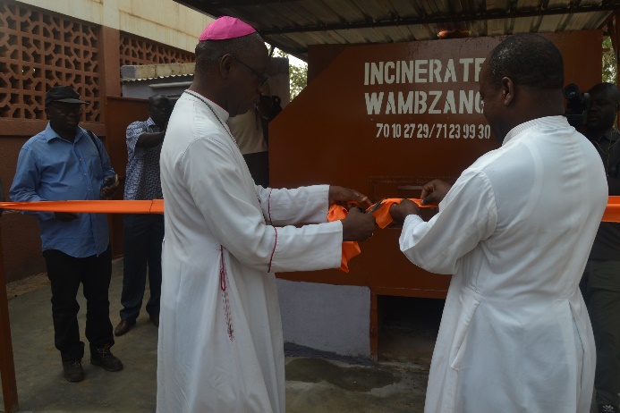 Après la remise des prix, Monseigneur a procédé à la coupure du ruban de l’incinérateur « Wambzanga » et les invités ont pu visiter le local de production d’eau de javel. Une collation est venue mettre fin à cette cérémonie de clôture du Projet « Contribution au renforcement des capacités des structures sanitaires et scolaires dans la lutte contre les maladies infectieuses ».