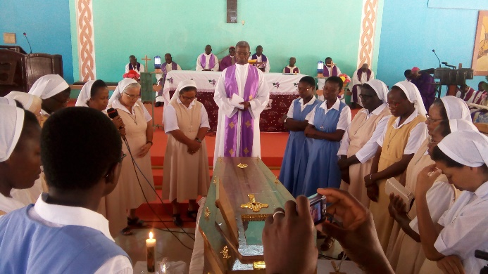 Dans son homélie, Monseigneur Joachin OUEDRAOGO a, de prime à bord, rappelé qu’il est très douloureux pour un évêque de perdre un agent pastoral. Il a ensuite ajouté que la sœur Lala préférait mourir en elle-même pour que vivent les autres. La vie de sœur Lala était calquée sur sa devise : « il y a plus de bonheur à donner qu’à recevoir ». Monseigneur a poursuivi en disant qu’il y a un examen que tout le monde va passer et dont on connaît par avance les six (06) questions que Monseigneur a tiré de l’Evangile. Il n’y a pas de recalé ni de second tour : la mort.