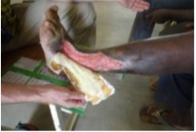 La plus part des villages n’ont pas de médecin, et profitent de notre passage pour présenter des pathologies diverses et variées, comme ce jeune garçon de 11 ans atteint d’insuffisance rénale que nous avons tenté d’hospitaliser en urgence, mais nous nous sommes heurtés aux coutumes et à la culture si différentes des nôtres !!! Beaucoup de plaies, d’ulcères, que nous traitons avec le peu de matériel que nous avons. La compression médicale étant souvent la base du traitement. Bien sûre officiellement nous sommes là pour les malades atteints d’éléphantiasis mais ils ne représentent qu’une petite partie de notre activité…