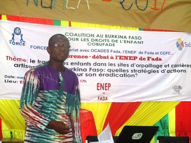La thématique qui a fait l’objet de débat entre les conférenciers Monsieur COMBARY Serge, Directeur Provincial de l’Action Sociale du Gourma et Monsieur DOMBOUE Théodore, représentant du réseau FORCE et les participants était la suivante : « travail des enfants dans les sites d’orpaillage et carrières artisanales au Burkina Faso : quelles stratégies d’actions pour son éradication ? ».