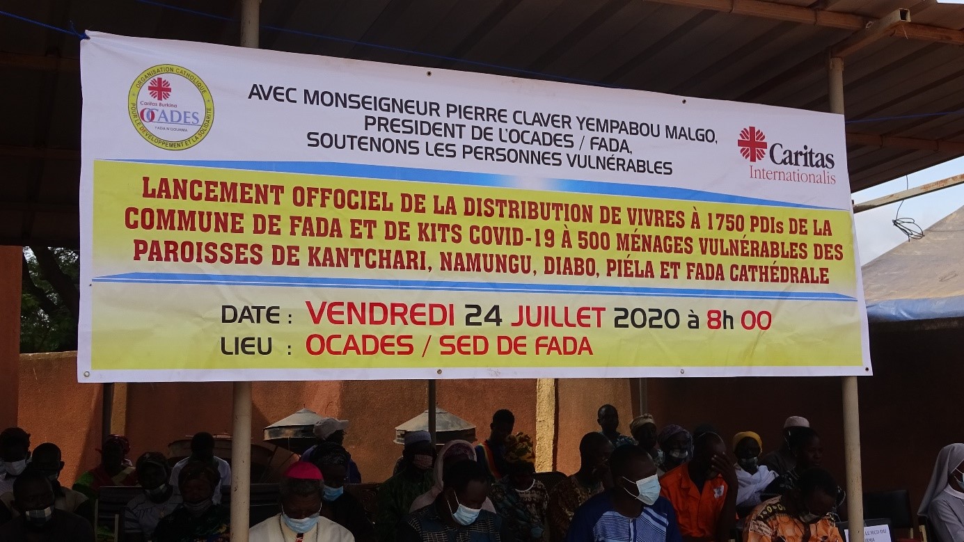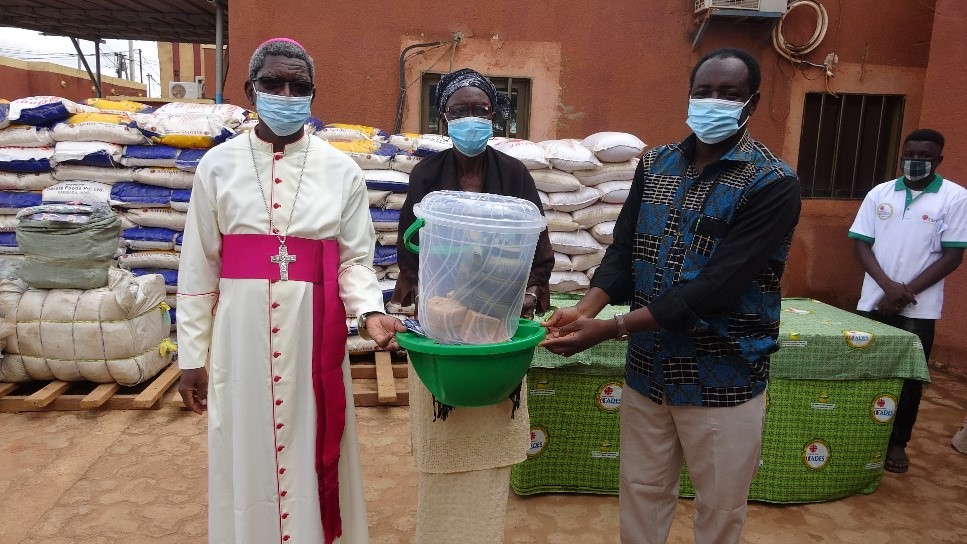 Comme souligné plus haut, dans le but de soutenir les communautés vulnérables par la création de conditions propices et résilientes à la COVID-19, l’OCADES Caritas Burkina a tenu à apporter sa pierre dans la lutte contre la maladie à Corona virus. D’où cette œuvre de charité au profit des personnes déplacées interne de Fada. Le don est composé de 525 laves mains, 7440 boules de savons, 500 bidons de 20 litres d’huile, 7000 masques et 500 flyers d’une valeur totale de 13 130 300F CFA, au profit de 500 personnes vulnérables au niveau des cinq paroisses du Diocèse ainsi que 5 sites sensibles.
